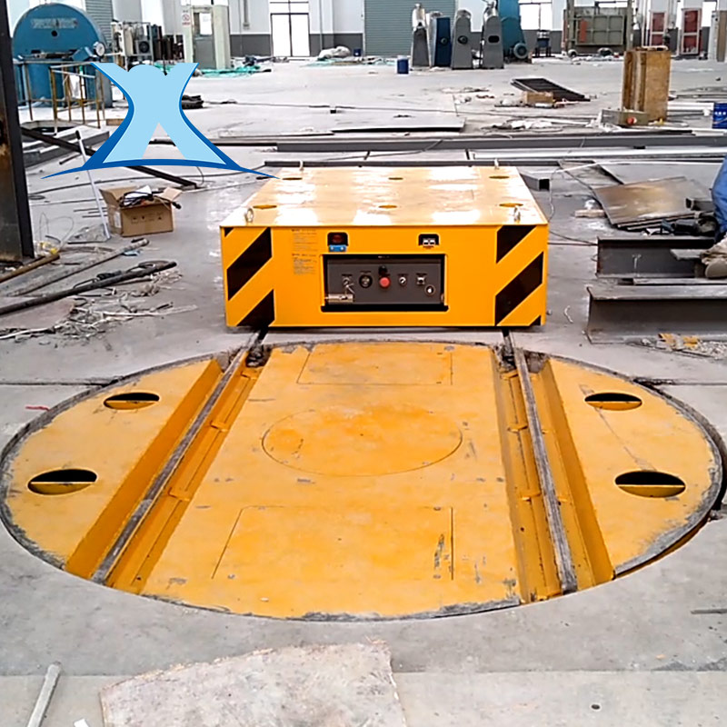是一種以實現軌道平車原地轉彎換向的設備,安裝在兩條軌道交叉的位置,其臺面上鋪設一條或多條軌道,軌道上表面與地面上的軌道上表面平齊,軌距與地面的軌距一致,平車完全運行至轉盤上停止,轉盤啟動轉動至需要的角度與地面的軌道完成對接,平車再次啟動沿對接后的軌道運行至需要的位置。其特殊的功能是軌道運輸系統中常見的設備。臺車自重加載重就是配套轉盤的載重量,轉盤的旋轉角度可根據客戶的不同需求設定,可實現360度任何一個角度停止,也可實現井型十字交叉運行。